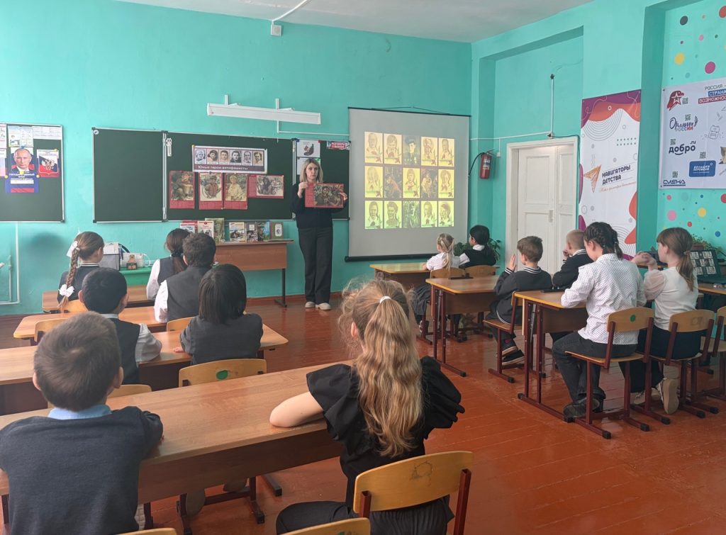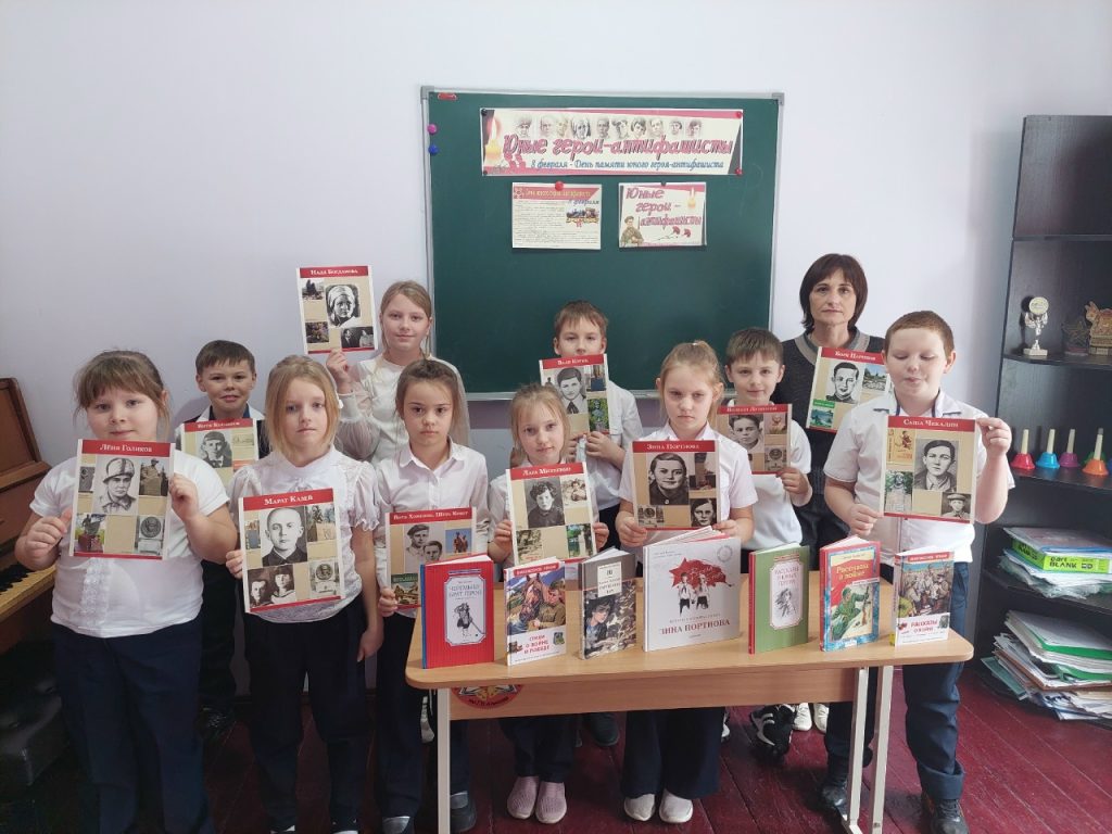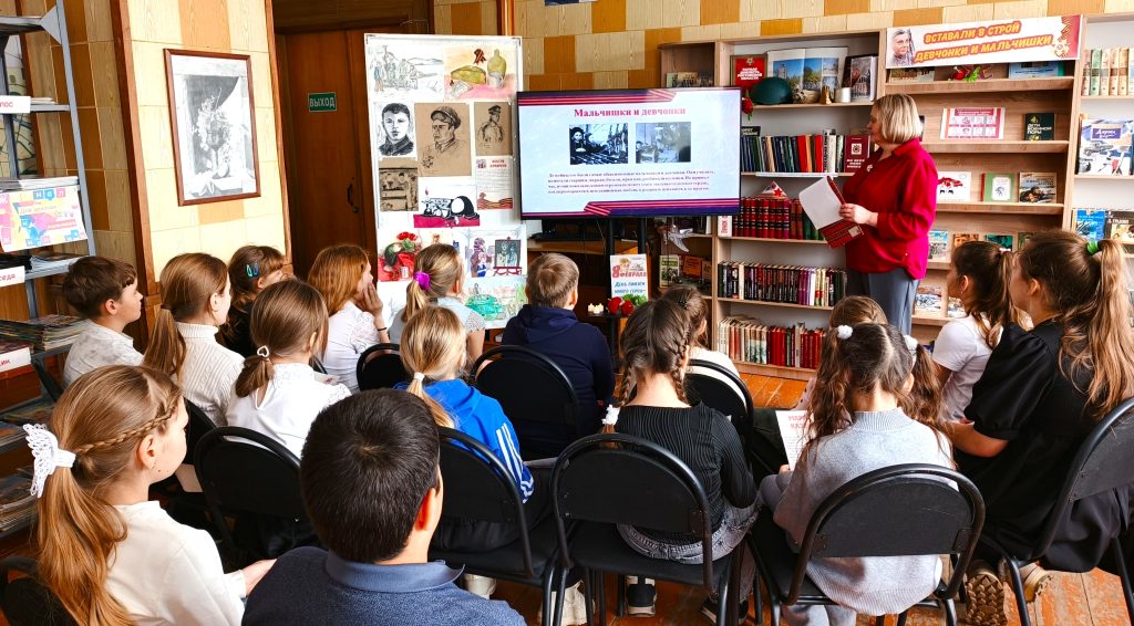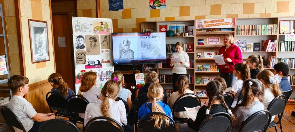 Библиотекарь рассказала ребятам о мальчишках и девчонках, которые за подвиги, совершённые в годы Великой Отечественной войны, были удостоены самой высокой награды Родины — звания Героя Советского Союза. Школьники с интересом слушали рассказ о своих ровесниках: Лёне Голикове, Марате Казее, Вале Котике, Зине Портновой и других пионерах-героях, чей подвиг навеки останется в памяти поколений.