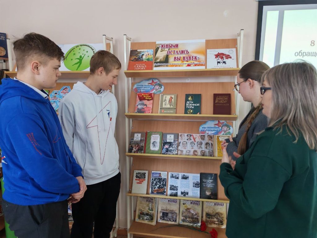 Урок мужества сопровождался обзором книг, представленных на выставке «Войной изломленное детство». Дети познакомились с произведениями Сергея Алексеева, серией книг о пионерах-героях, сборниками о Великой Отечественной войне и другими материалами.