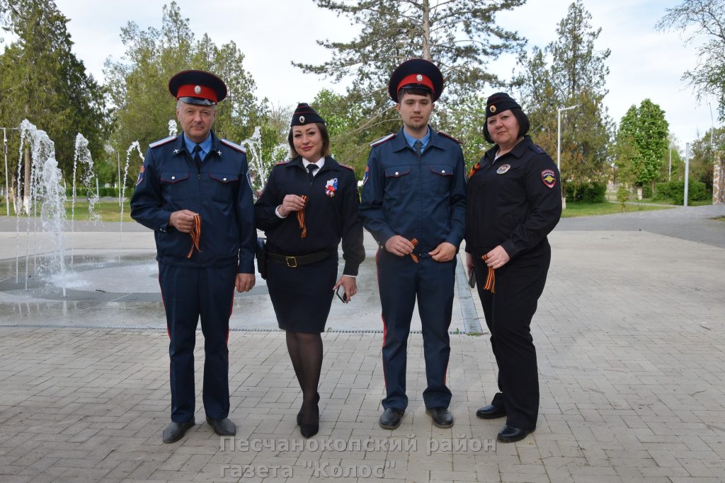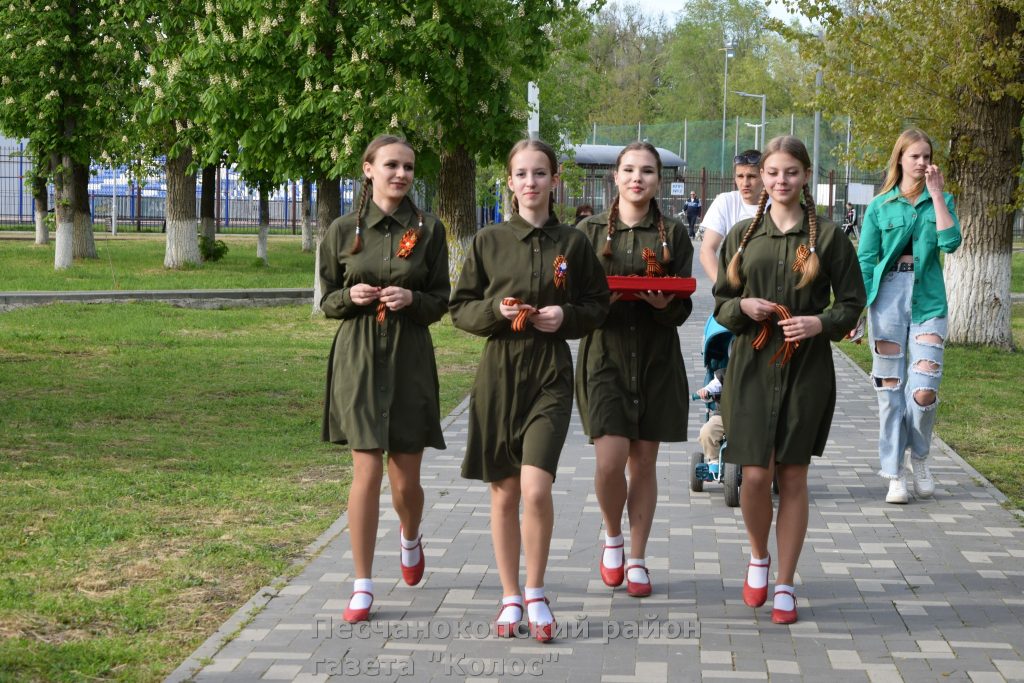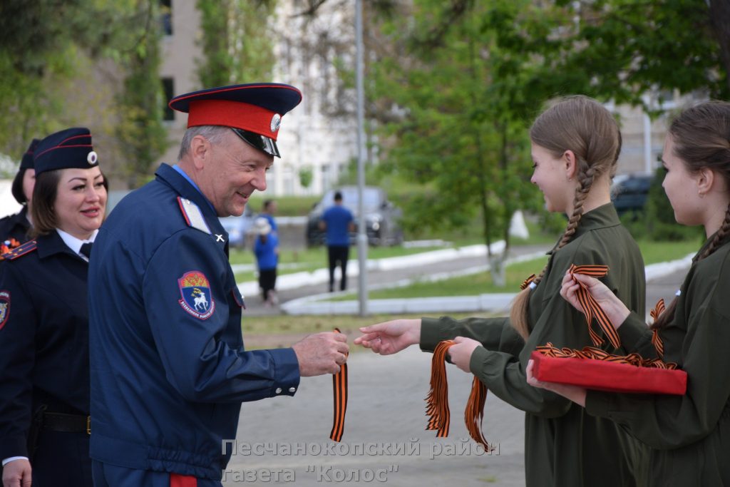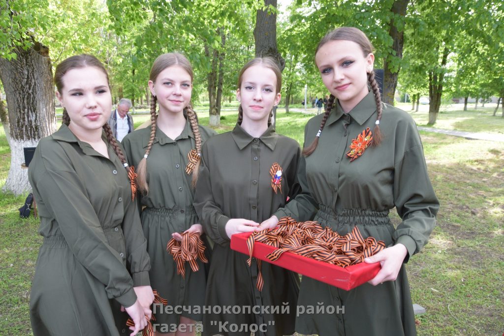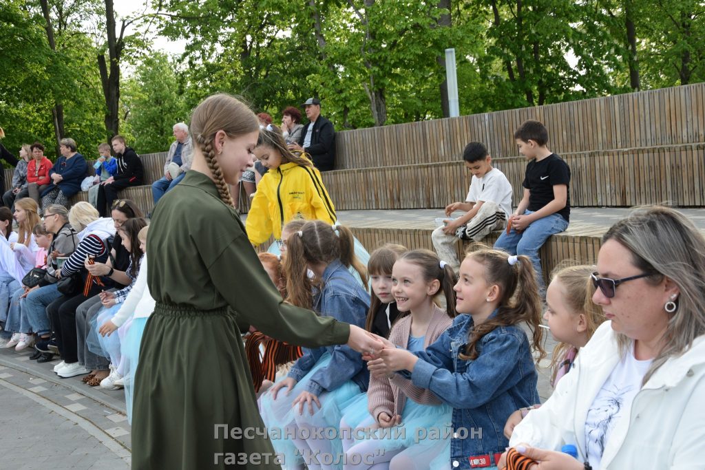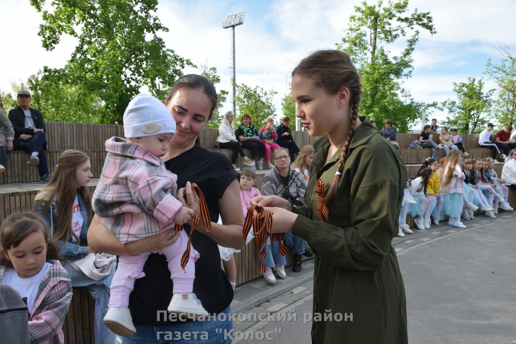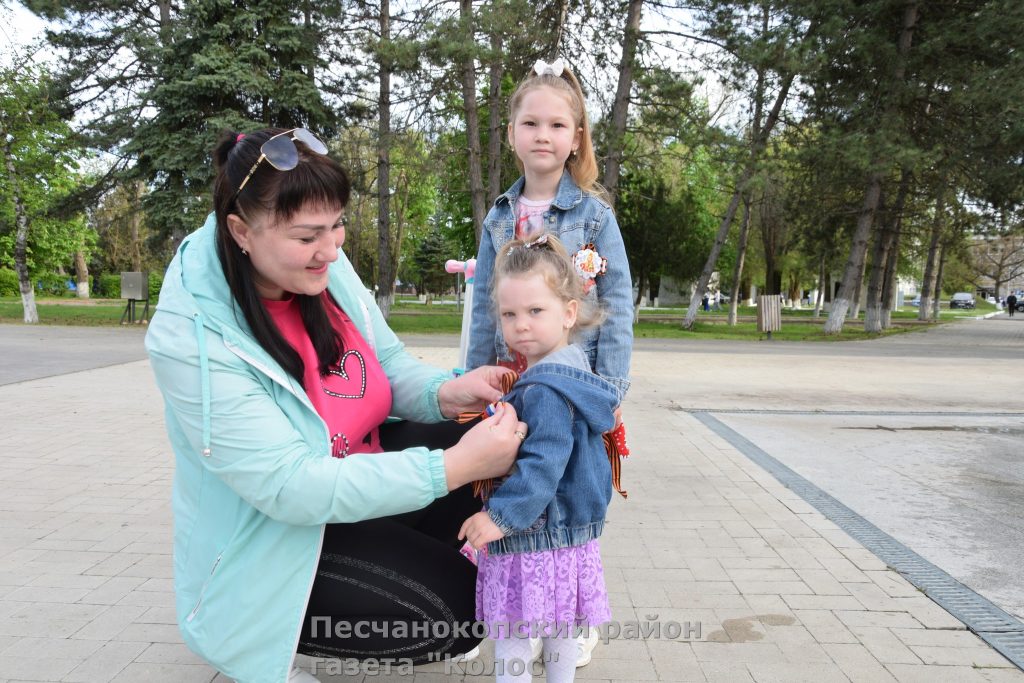 В рамках мероприятия состоялась патриотическая акция «Георгиевская ленточка», организованная по сложившейся многолетней традиции, редакцией районной газеты «Колос» и отделом культуры, спорта и молодежи администрации Песчанокопского района. Приятно было видеть, что жители с благодарностью принимают черно-оранжевый символ Победы. Многие тут же крепили ленту на одежду.