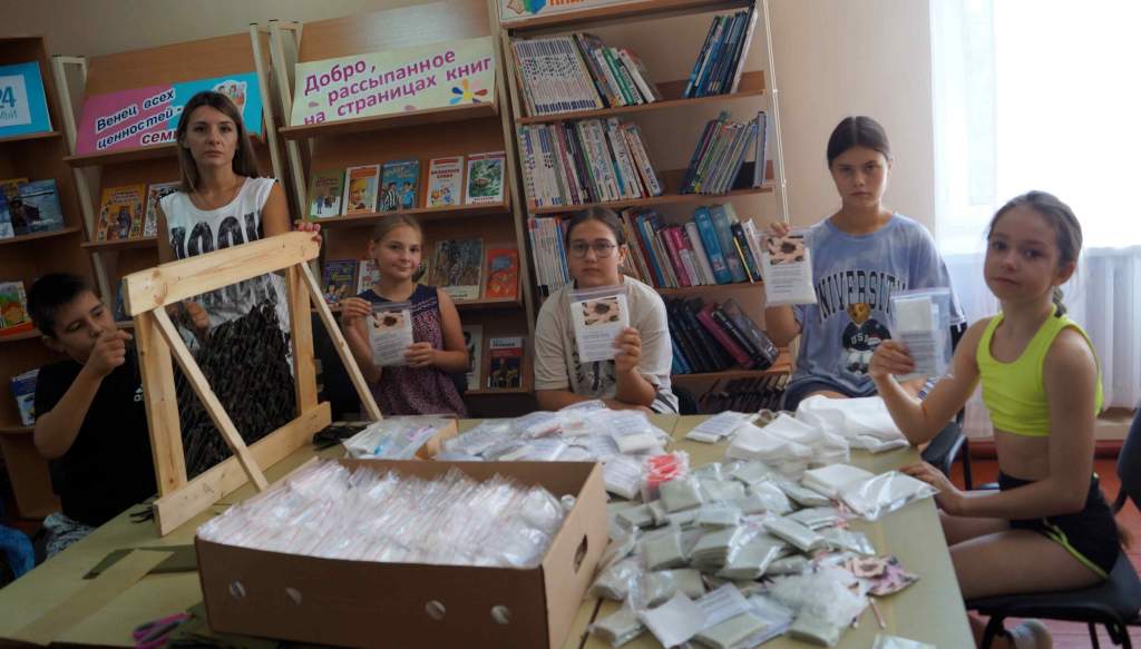 Ребята, читатели детского отдела Песчанокопской МЦБ плетут для участников СВО маскировочные сети. Техника плетения маскировочной сети несложная, но трудоёмкая, с наставником С. Толмачевым дети освоили плетение быстро. Чтобы сделать шестиметровое полотно, требуется несколько дней. Дети, говорят, для них в радость хоть как-то помочь бойцам на передовой. Говорят, — «Если их сеть сможет укрыть от вражеского дрона хоть одного бойца — это уже радость». Ради этого им не жалко потратить несколько часов уходящего лета. Мы все верим, что их маленький вклад приблизит бойцов к победе. А бабушки — жительницы улицы Народная, вечерами нарезают те самые ленты для плетения.