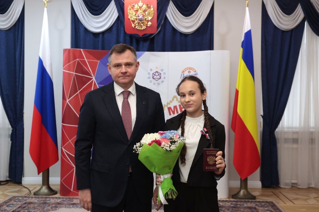 В День Конституции губернатор Ростовской области Юрий Слюсарь вручил первые паспорта 15 лучшим школьникам Дона. Среди них — активистка активистка Развиленской школы №9, советник председателя местного Совета Первых Яна Шелюх.