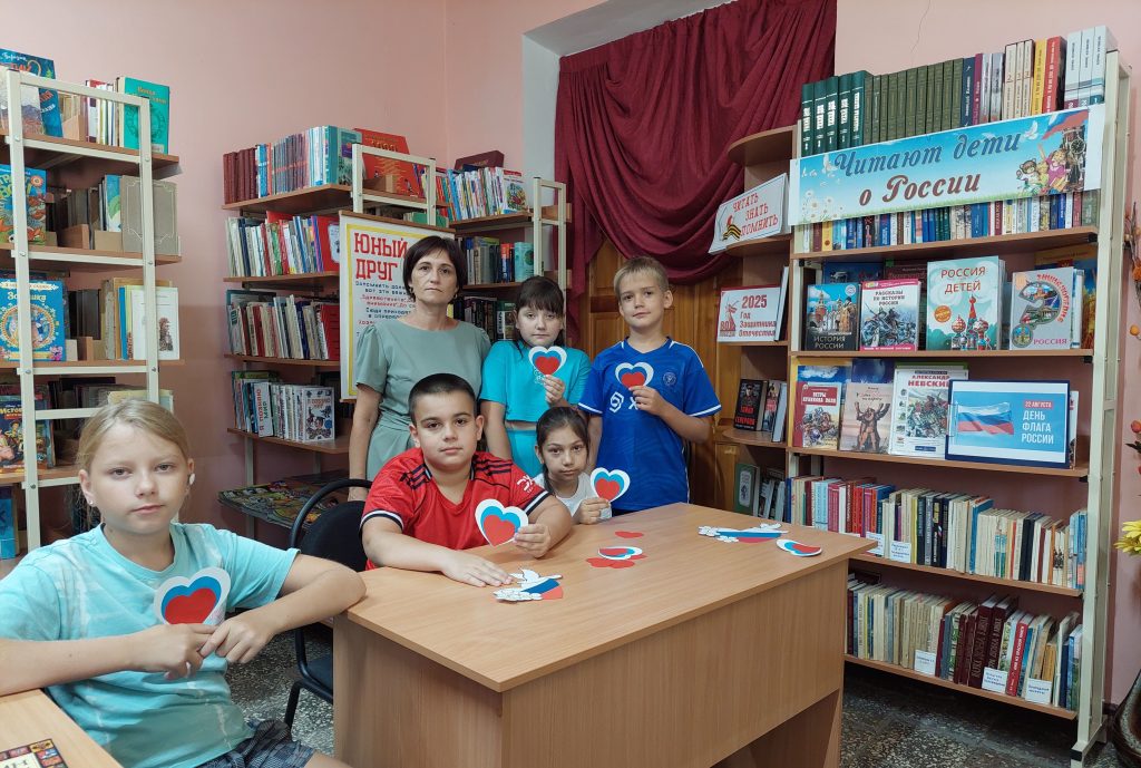 Затем дети отгадывали загадки о российской символике, играли в подвижные игры, собирали из цветной бумаги флаг. К мероприятию была подготовлена книжная выставка «Триколор моей России».