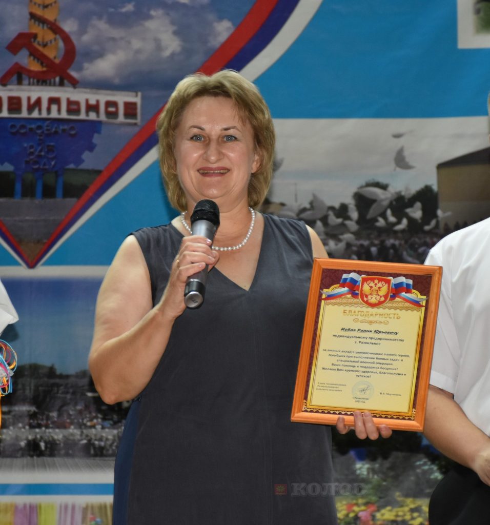 Глава поздравила всех с юбилеем села и поблагодарила за постоянную помощь неравнодушных жителей Развильного и вручила благодарности постоянному меценату, оказывающему поддержку селу и фронту Дмитрию Сергеевичу Полякову и индивидуальным предпринимателям Ронни Юрьевичу Иобая и Татьяне Николаевне Корепановой, организаторам группы «Холодный цех» Ирине Ильиничне Хатько, Анне Александровне Коломыцевой и Марине Петровне Кислица, активистке волонтерского движения «Родные и близкие» Юлии Олеговне Елисеевой. Особо волнительным стало видео — поздравление земляка с позывным «Батайск», находящегося в эти дни на СВО, который от всей души поблагодарил волонтеров и пожелал всем мира и добра.