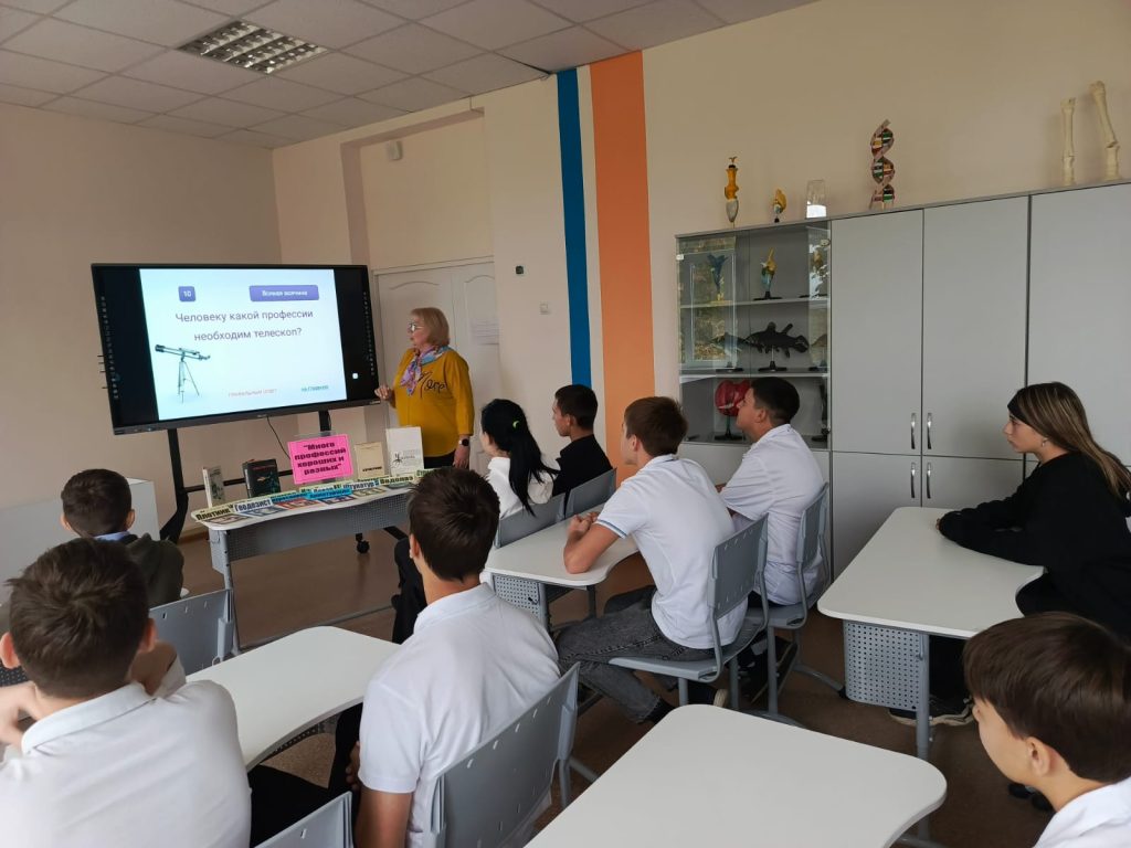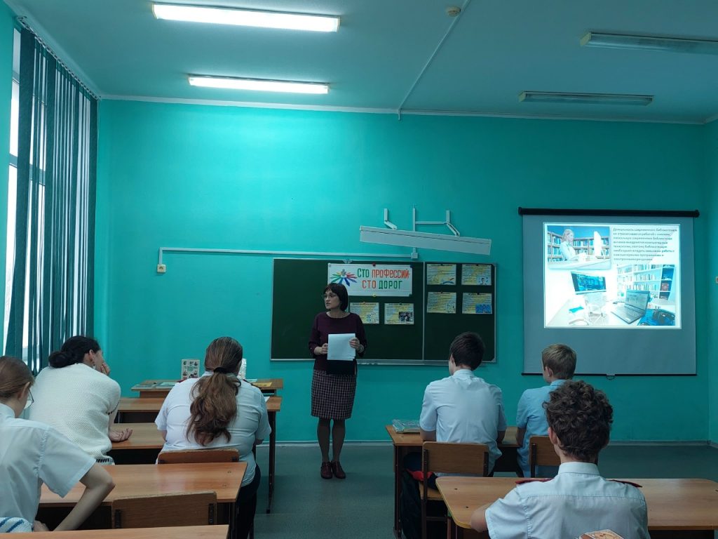 Далее библиотекарь рассказала школьникам о профессии библиотекаря: её истории, основных аспектах и разнообразии задач, которые решает современный специалист, работающий в библиотеке. А также о модельных библиотеках, которые открываются в нашей стране и которым необходимы молодые специалисты.
