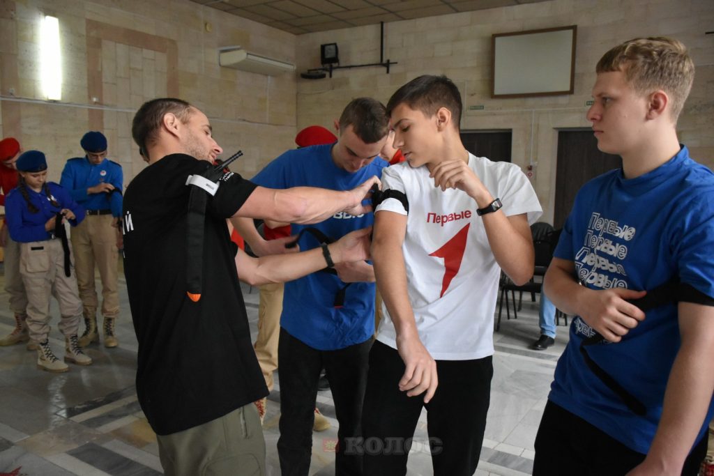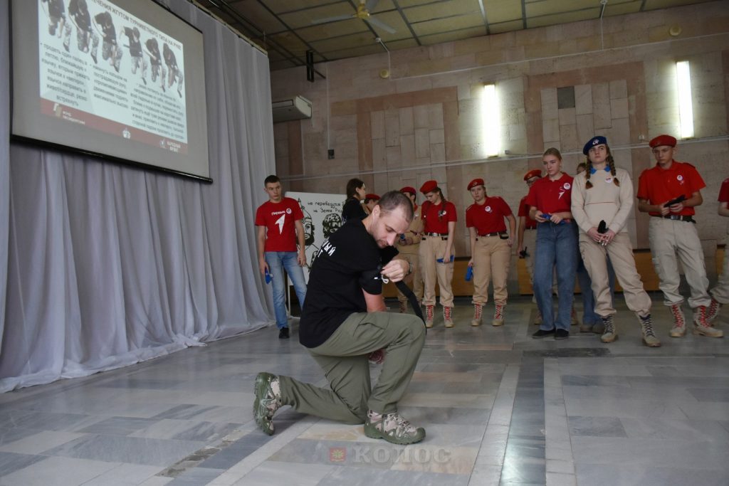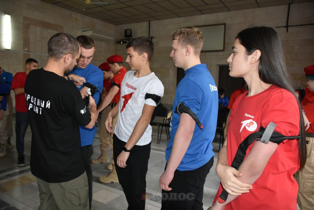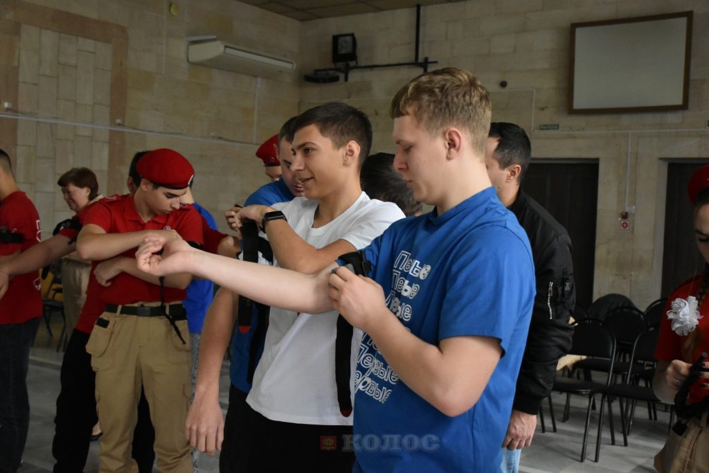 А. Асаулов рассказал ребятам, где можно столкнуться с травмами в самых обыденных ситуациях, объяснил, почему кровотечение опасно для жизни, в чем разница между жгутом и турникетом, и как правильно пользоваться кровоостанавливающим устройством самостоятельно. Каждый из участников смог опробовать турникет на себе.