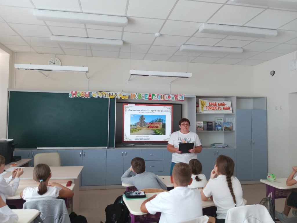 Библиотекарь Богородицкого отдела для учащихся 3 класса МБОУ БСОШ №20 провела краеведческий вернисаж «Мой край раскинулся широко». Началось мероприятие с исторической справки, возникновения Ростовской области, о её достопримечательностях и памятниках архитектуры, о талантливых людях, проживавших на Донской земле в разное время, о её культурной жизни. Ребятам, принимавшим участие в беседе, рассказали, что достопримечательности Ростовской области не ограничиваются только памятниками истории и культуры, она также славится природными заповедниками и великолепными ландшафтами, многие из которых наделены статусом памятников природы областного и федерального значения.