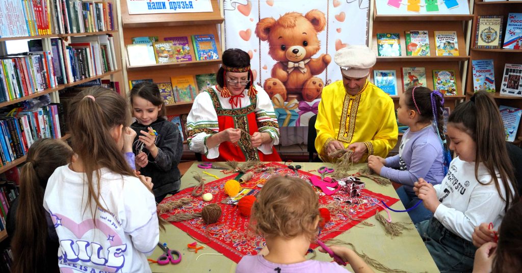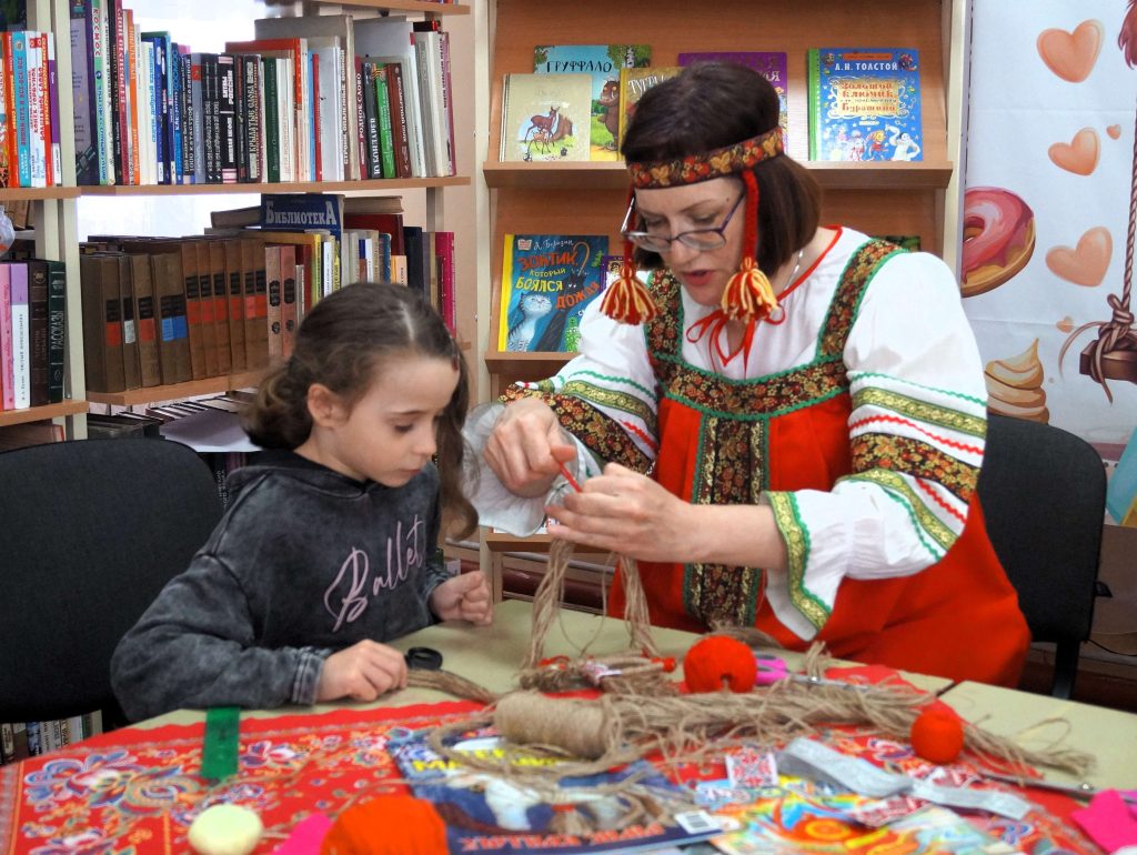 Библиотекарь Т.Б. Салато и волонтер культуры А.Ф. Сотников рассказали ребятам о русских народных игрушках и о различных техниках их изготовления.