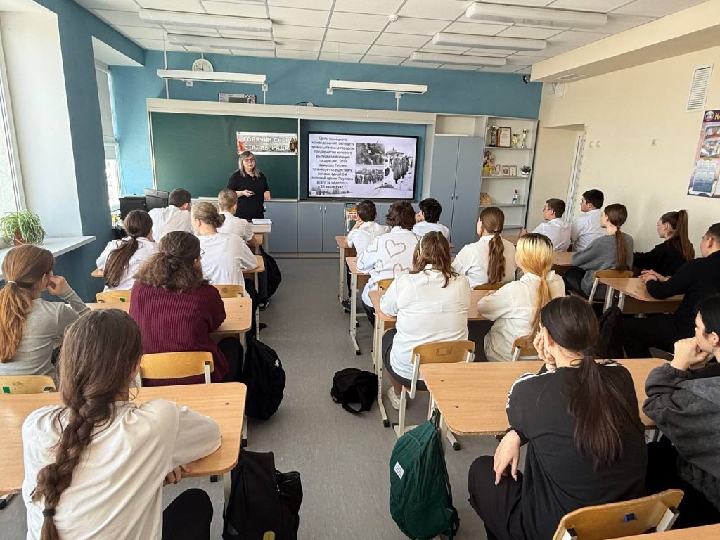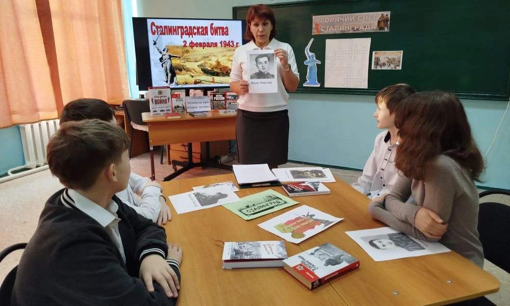 На уроке памяти «Герои Сталинградской битвы» для обучающихся 6 класса МБОУ ПСОШ №29 была представлена информация о подвигах защитников Сталинграда и значении Сталинградской битвы как коренного перелома в Великой Отечественной войне. Были приведены ключевые цифры и факты: 200 дней и ночей обороны, значение приказа №227 «Ни шагу назад!». И использованы материалы презентации «Сталинградская битва – Великая битва на Волге» с фотографиями военных лет, картой битвы, портретами героев: В.Г.Зайцева, М.А. Паникахи и Я.Ф. Павлова, показаны видеофрагменты из документальных фильмов. В заключение в память о всех погибших защитниках города была объявлена минута молчания.