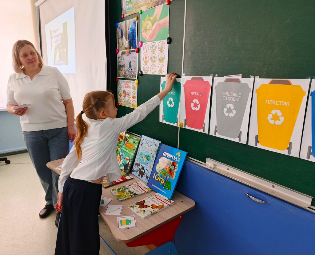 В ходе мероприятия ребята изучали информацию о раздельном сборе мусора — на полках были выставлены образцы контейнеров для стекла, пластика и бумаги. Библиотекарь провела мини-лекцию о том, как переработка отходов помогает сохранять планету. Ребята активно участвовали в обсуждении: задавали вопросы, делились своими идеями о том, как можно помочь природе. В завершение каждому участнику вручили буклет с полезными советами по экологичному образу жизни — например, как экономить воду и электроэнергию, правильно утилизировать батарейки и пластик.