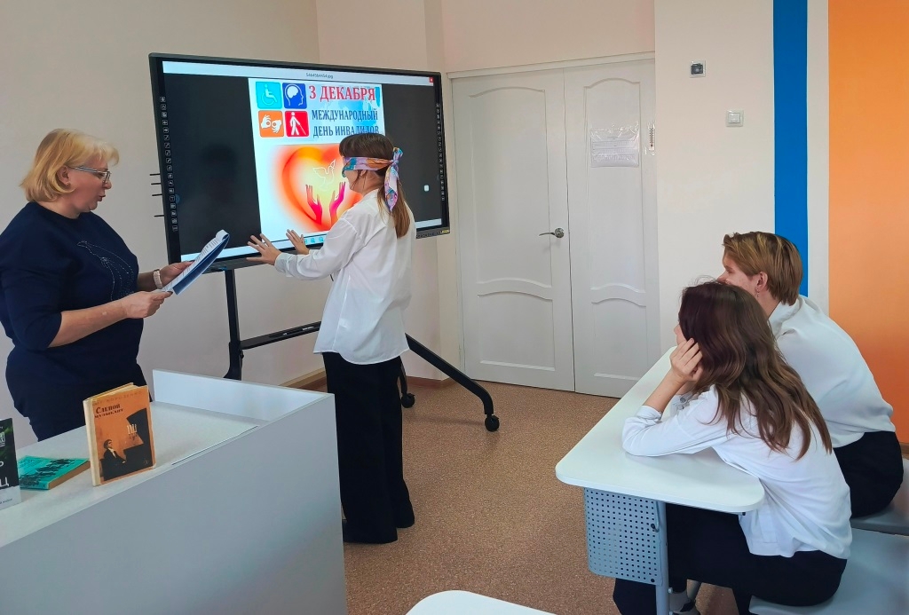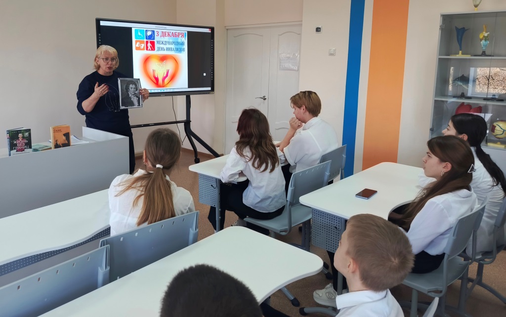 Библиотекарь Богородицкого отдела для обучающихся 7 класса МБОУ БСОШ №20 провела час общения «Вместе мы сможем все…»,посвященный Международному дню инвалидов. Ребята услышали историю возникновения Международного дня инвалида. Библиотекарь заострила внимание детей на том, что инвалиды — это особенные люди, но они все же такие же, как и мы, и они так же хотят посещать кинотеатры, кафе, магазины, библиотеки, больницы, только чуть больше, чем остальные нуждаются в помощи. Эти люди обладают огромным мужеством, необычайной силой воли и жизнелюбием. Ребята попробовали на себе ощутить бытовые проблемы инвалидов. С помощью видео-презентации узнали о российских параолимпийцах, доказавших всему миру, что они великолепные спортсмены. Подтверждением этому стали многочисленные победы, кубки и золотые медали, привезенные с разных уголков земного шара.