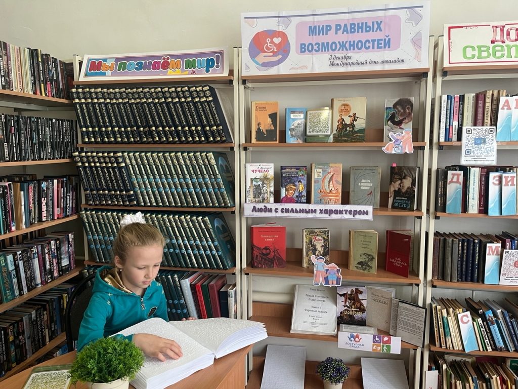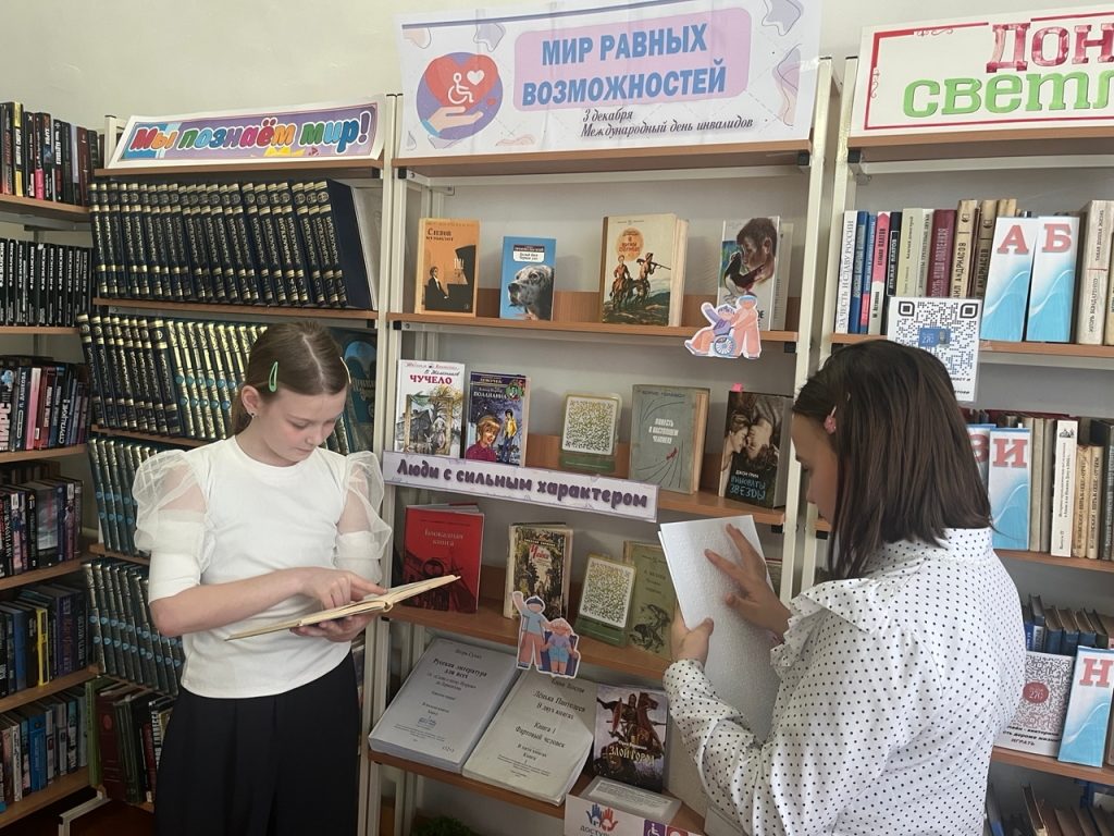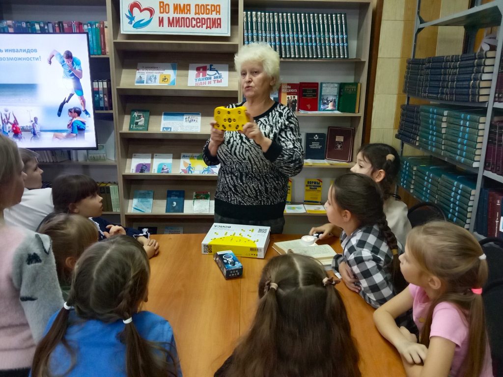 Вниманию ребят была предложена книжная выставка «Во имя добра и милосердия», на которой представлены художественные произведения о людях с ограниченными возможностями, а также «говорящие книги», книги со шрифтом Брайля.