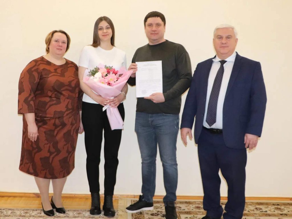 27 февраля глава района Виталий Лозин вручил свидетельство на улучшение жилищных условий молодой семье Андрея и Ольги Черкасовых из села Песчанокопское.