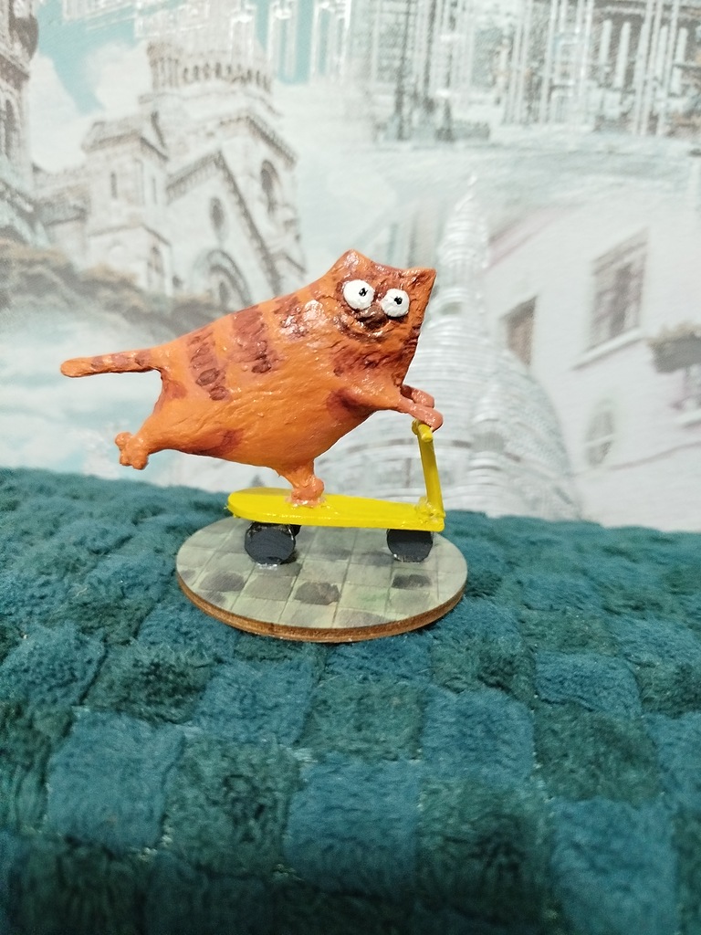 — Как-то делала котика на зимнюю тему, решила сделать его на лыжах, но ведь надо не просто поставить кота на лыжи… А как передать это движение, полет?… Ну, конечно, развевающимся за спиной шарфом. А как это сделать? И начинается процесс… проволочку вставить, закрепить, высушить, подмазать, подкрасить… И вот это уже не просто котик на лыжах, а котик, который мчится с горы…, — рассказывает мастер.