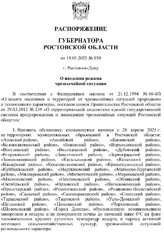 Это решение направлено на поддержку аграрного сектора и обеспечение компенсации потерь. Министерству сельского хозяйства региона поручено собрать необходимые документы для определения масштабов ущерба и площадей, пострадавших от заморозков, с целью последующей выплаты страховых возмещений.