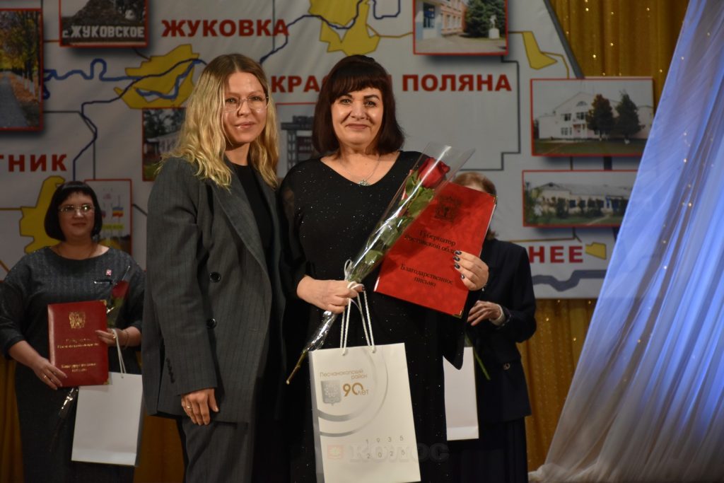 Со сцены звучали теплые слова от депутата Государственной Думы Ларисы Тутовой, которая сердечно поздравила своих земляков. Председатель комитета по охране объектов культурного наследия Ростовской области, куратор района Ирина Коробова зачитала приветственный адрес губернатора Ростовской области Юрия Слюсаря. Поздравили жителей и вручили награды в различных номинациях заместители главы района Марина Хомец, Эдуард Ткаля и Нина Придворова.