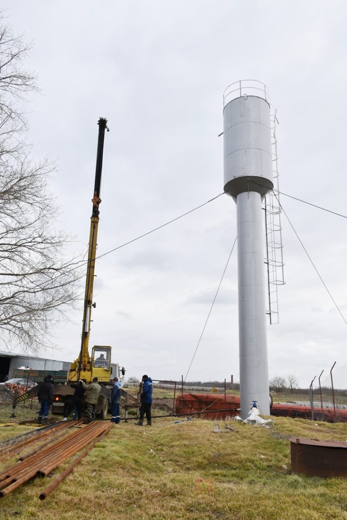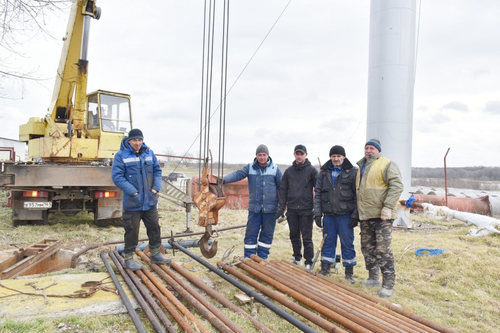 В день нашей встречи бригада занималась заменой глубинного насоса на водонапорной башне (к слову, установленной в прошлом году). Старый насос с работой не справлялся, да и подходящая к нему труба практически сгнила. Отсюда и жалобы населения на плохой напор воды. Своей спецтехники у бригады нет, из райцентра прибыли автокран, грузовик с трубами и электрик — без него электрооборудование не отключить. Процесс замены насоса занял больше трех часов.