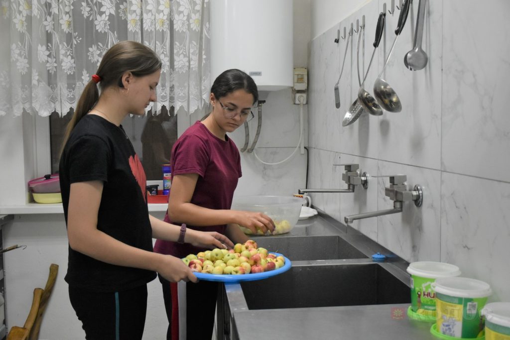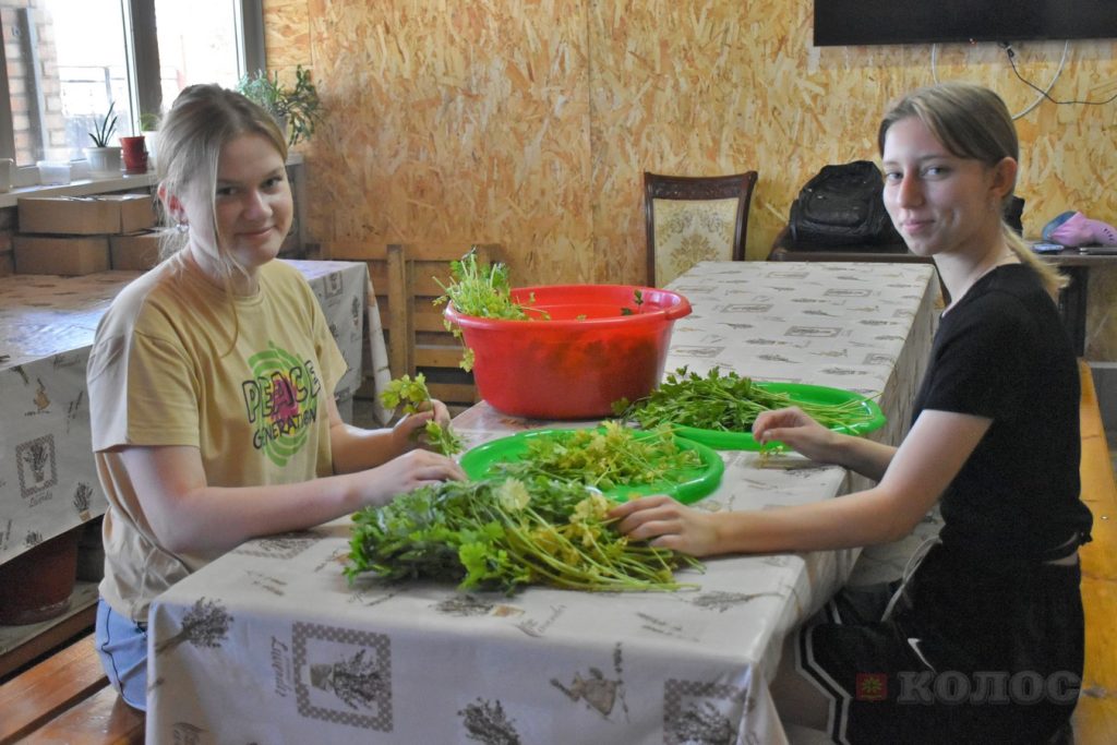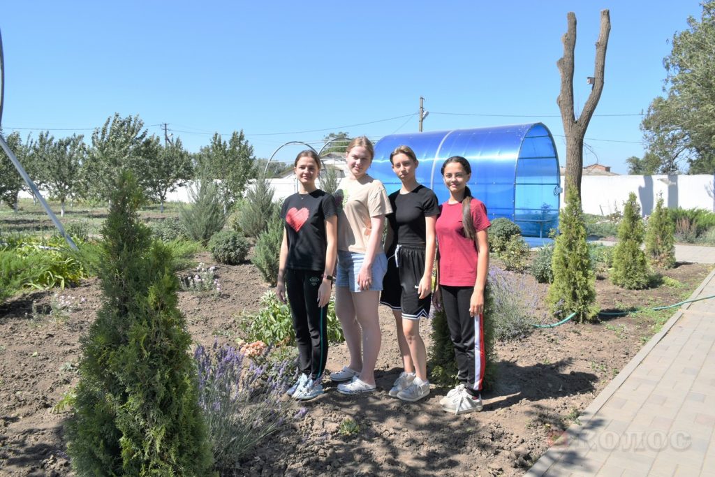 В горячую пору уборки помощь поварам очень необходима. Девчонки чистят овощи, собирают обеды в поле, накрывают на стол в столовой, моют посуду. Клумба тоже их зона ответственности.