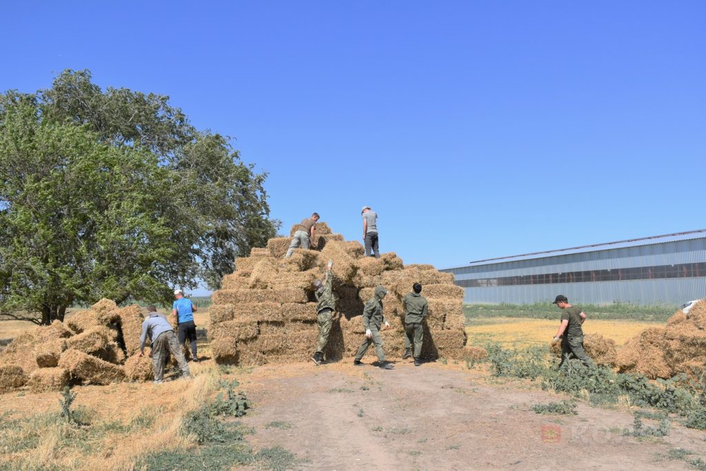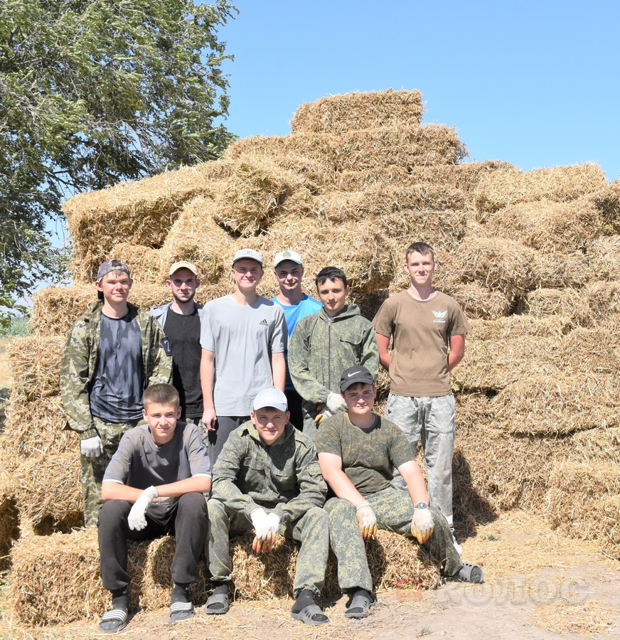 Ребята собирают в поле тюкованную солому и привозят в бригаду, складывают ее. Солома идет как на корм животным, которых выращивают для кухни, так и для пайщиков ООО «Агрос».