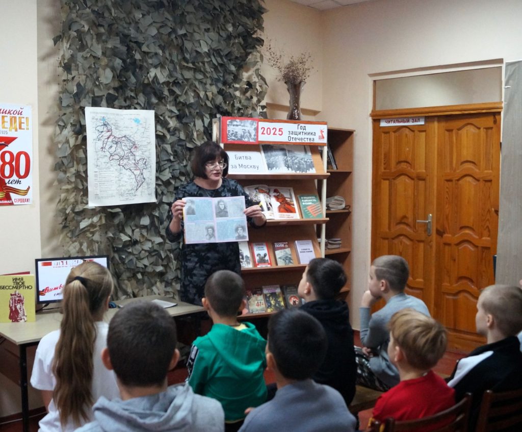 Библиотекарь Т.Б. Салато рассказала ребятам о битве за Москву, длившейся 203 дня, с 30 сентября 1941 по 20 апреля 1942 года. Участники узнали о легендарном подвиге 28 героев-панфиловцев и их политрука Василия Клочкова, произнёсшего бессмертные слова: «Велика Россия, а отступать некуда — позади Москва!». Особое впечатление на слушателей произвёл рассказ о военном лётчике Викторе Талалихине, совершившем первый ночной воздушный таран.