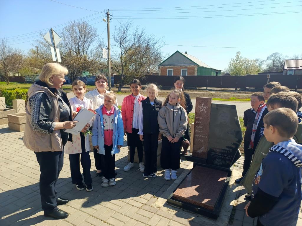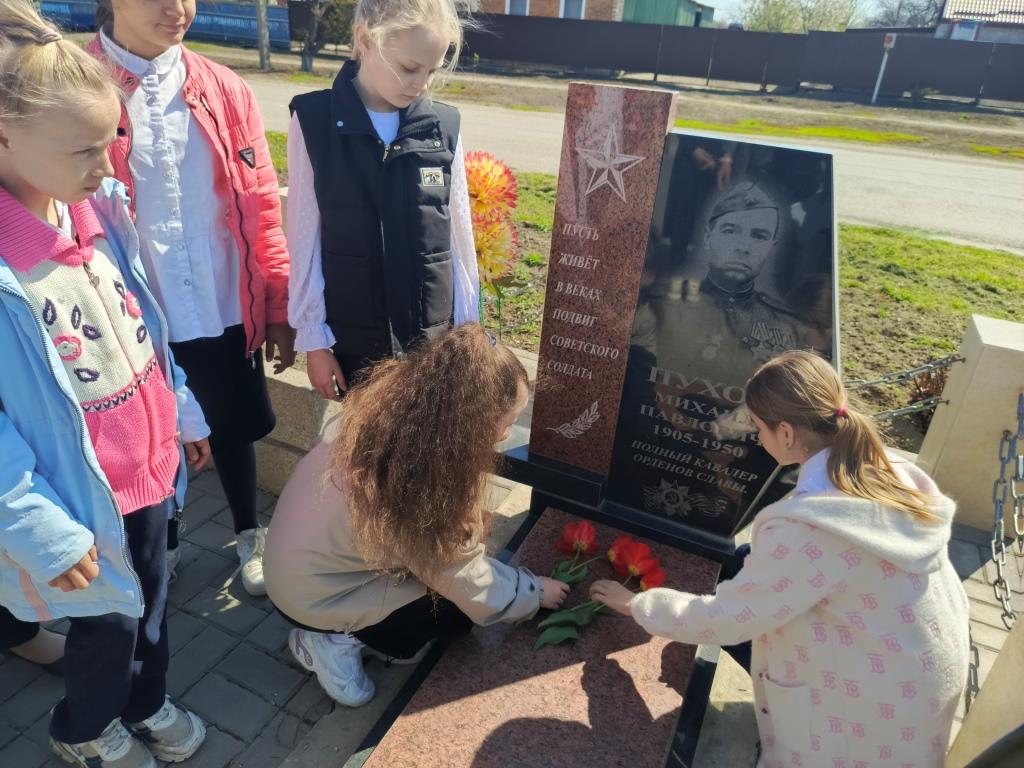 С особым интересом слушали ребята историю жизни и воинского пути односельчанина — Михаила Павловича Пухова, полного кавалера орденов Славы, которому в 2025 году исполняется 120 лет со дня его рождения. Библиотекарь рассказала о его возвращении домой и недолгого, но достойного труда в мирное время на благо родного села. Почтили память героя минутой молчания и возложили цветы на могилу.