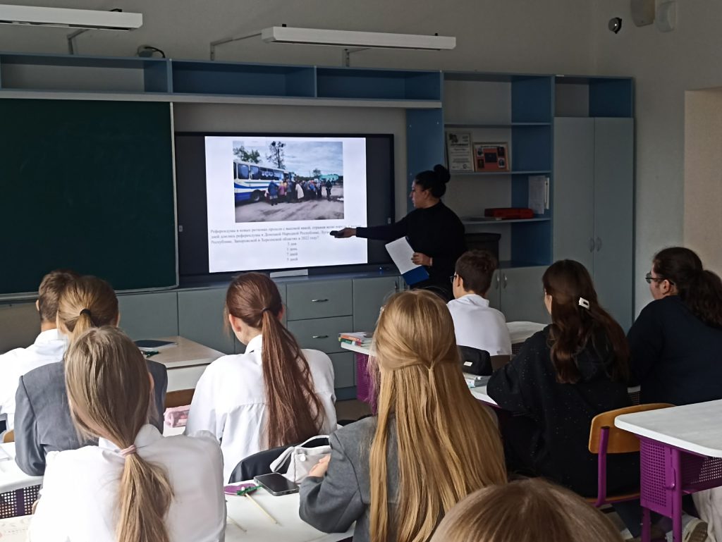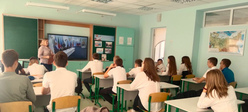 Ребятам рассказали об исторических событиях 2017-2022 годов, связанных с вхождением новых регионов в состав российской Федерации, затем посмотрели тематическую видеопрезентацию «Россия. Донбасс. Новороссия».