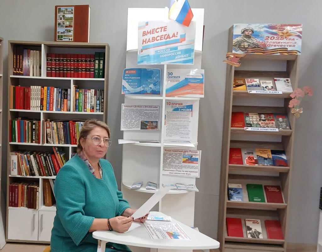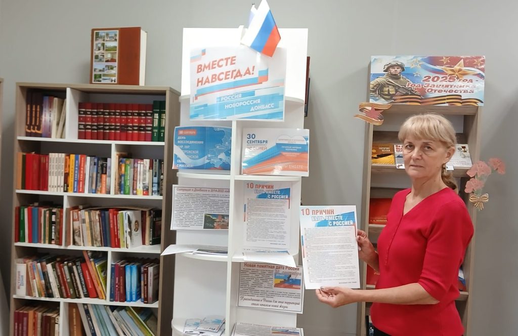 В Рассыпянском отделе была подготовлена тематическая полка «Вместе навсегда! Россия! Новороссия! Донбасс!». Для читателей представлены: литература об истории Новороссии, о борьбе Донбасса на пути к воссоединению с Россией, статьи из периодических изданий о новых территориях России. Также библиотекарь вручила участникам буклеты «Одна страна, одна семья, одна Россия!»