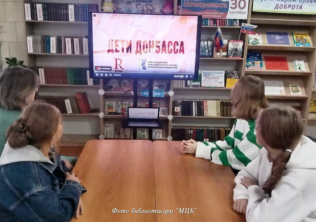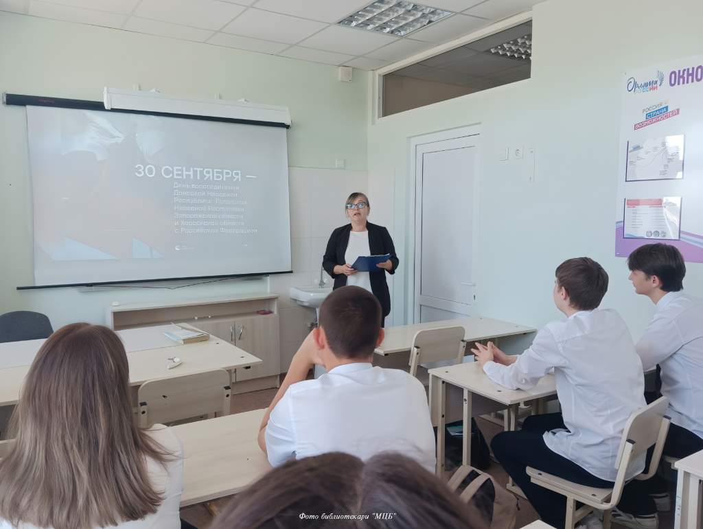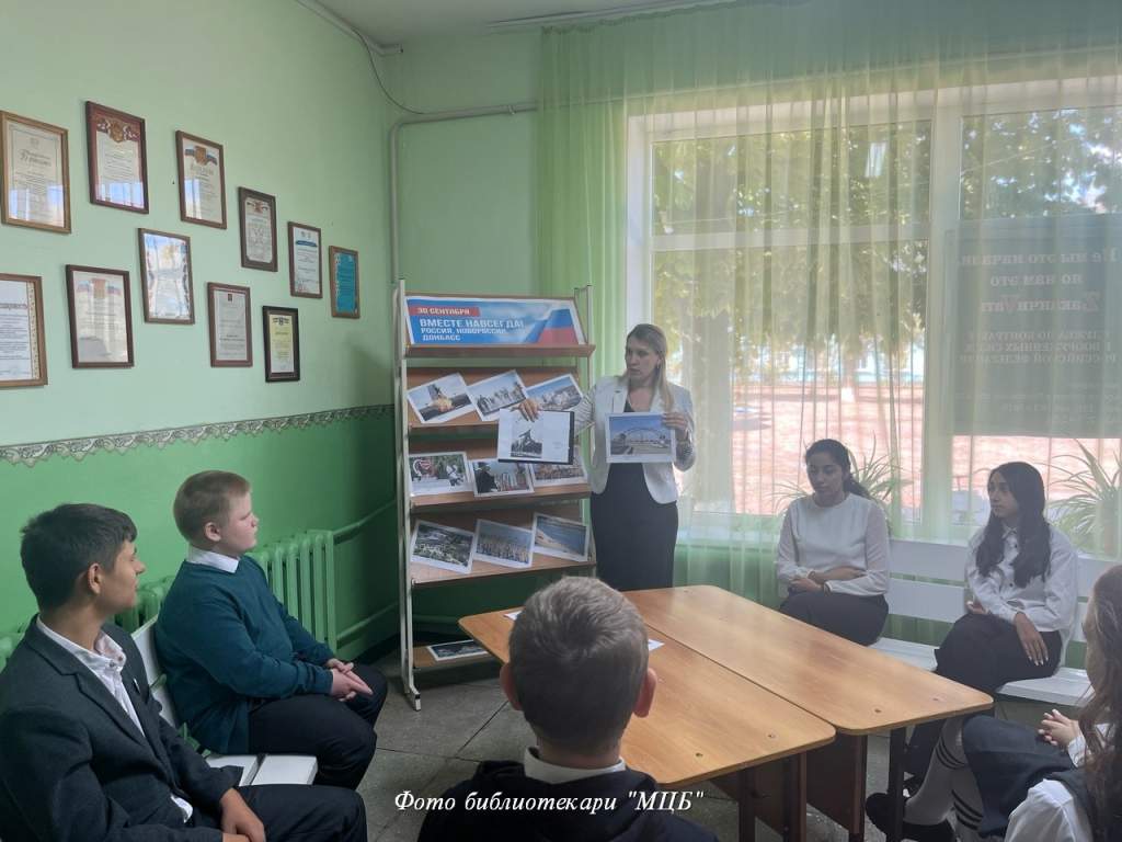 В рамках памятной даты — Дня воссоединения Донбасса и Новороссии с Россией библиотекарь Зареченского отдела «МЦБ» совместно с ДК провели информационный час «Мы вместе». Ведущие рассказали присутствующим историю вхождения новых регионов в состав Российской Федерации. Библиотекарь познакомила ребят с фотовыставкой «Россия — Донбасс — Новороссия» на которой были представлены фотоматериалы, связанные с событиями присоединения новых территорий, а также отражающие жизнь в Донбассе и Новороссии сегодня.
