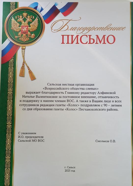 В рамках мероприятия члены сообщества тепло поздравили юбиляра Александра Александровича Татаркина с 85-летием, пожелав ему крепкого здоровья и бодрости духа. А также О.В. Смольков передал благодарственное письмо коллективу районной газеты «Колос» от руководителя Сальской МО ВОС за многолетнее плодотворное сотрудничество и в связи с 90-летним юбилеем районного издания.