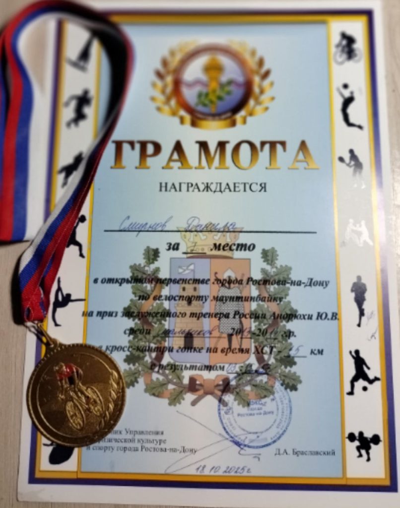 А на первенстве 18 октября велосипедист взял золото, опередив сверстников в велогонке по маунтинбайку на приз заслуженного тренера России Ю. Андрюхи в кросс-кантри гонке на время!