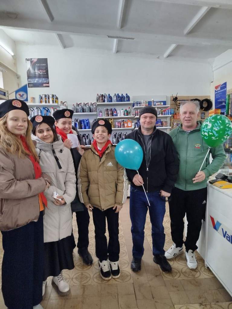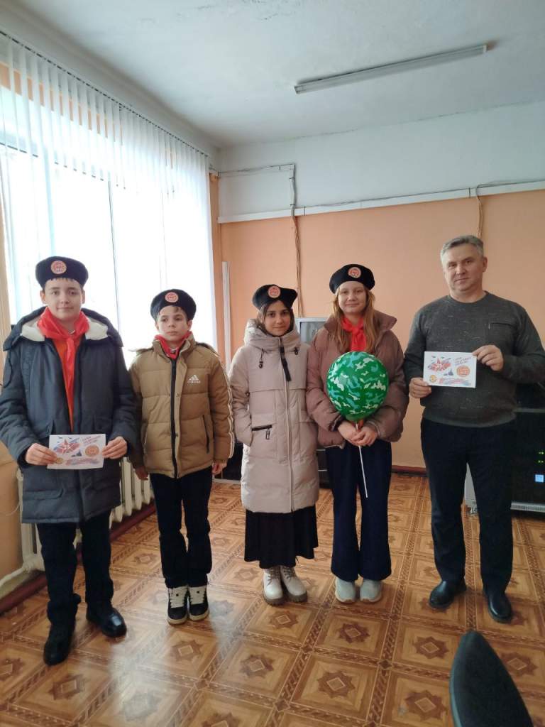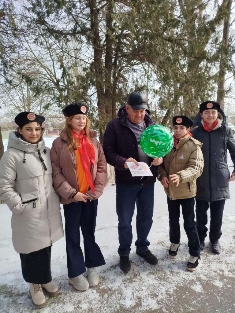 Вместе с и.о. председателя ВДПО Песчанокопского района Ириной Прокопенко ребята поздравили мужчин села с предстоящим праздником: читали стихи и дарили символические подарки – шары и открытки.